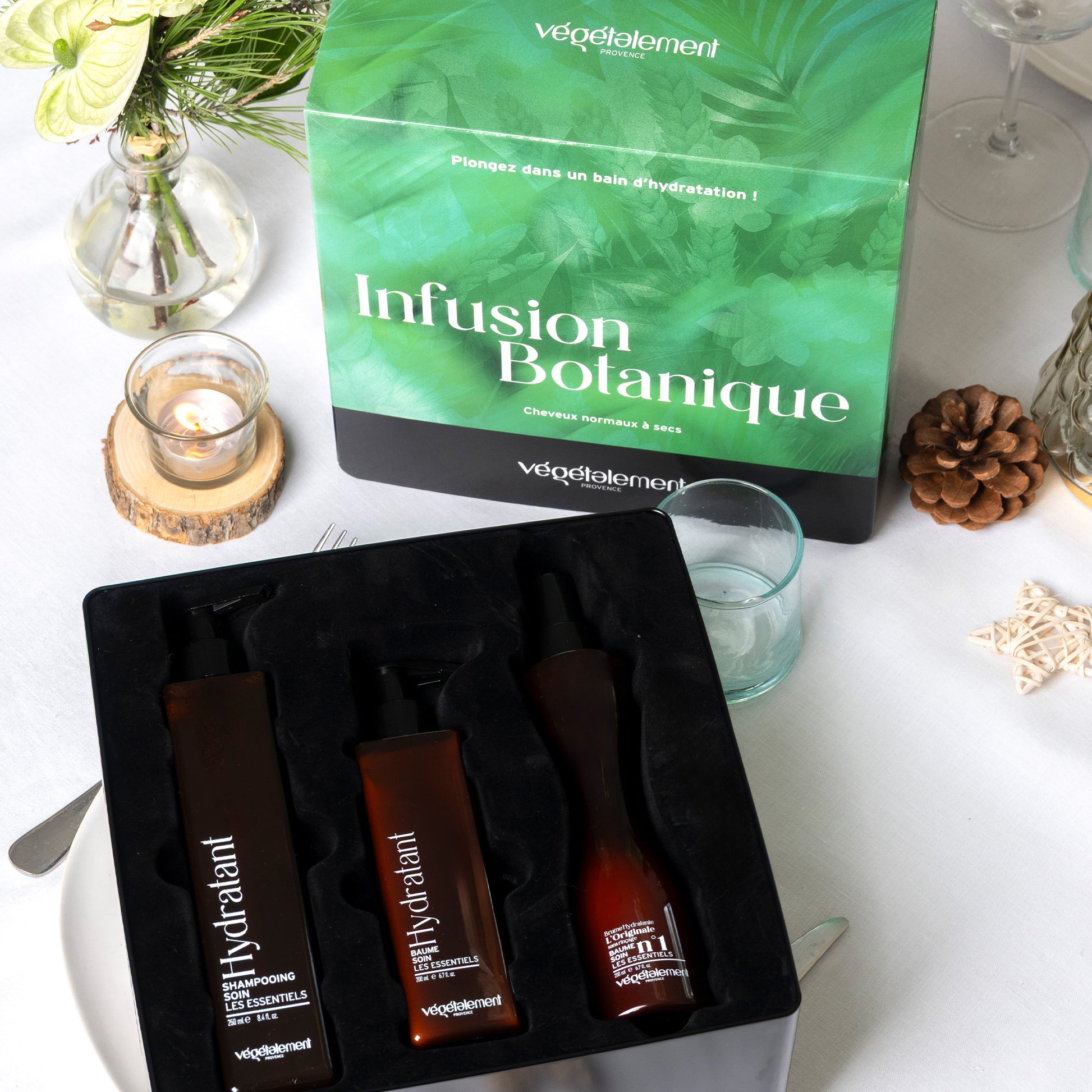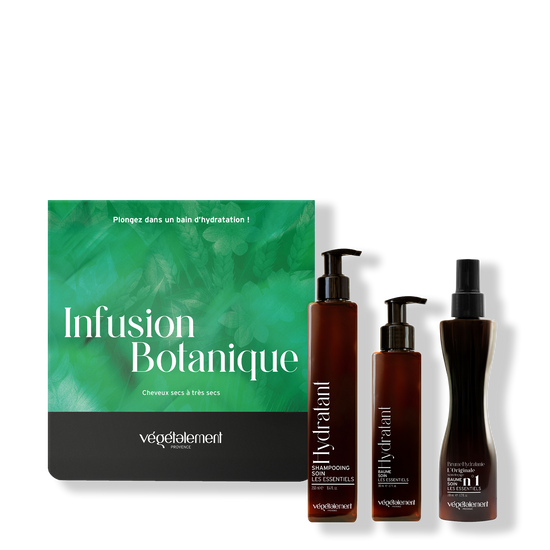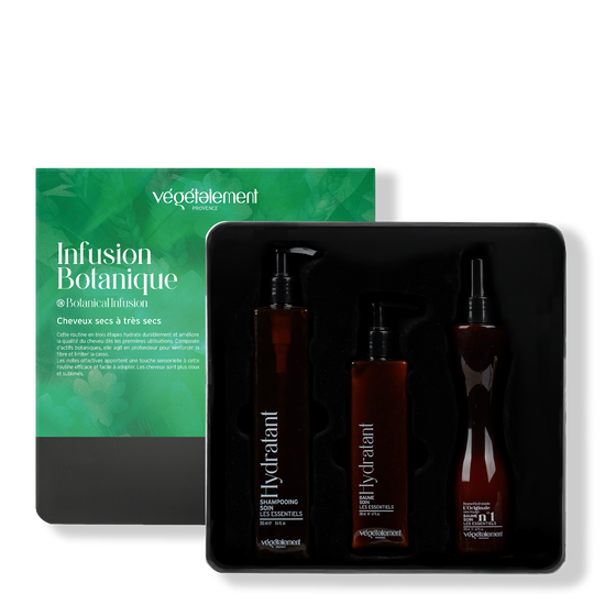 Le coffret Infusion Botanique réunit une routine complète d’hydratation dédiée aux cheveux normaux à secs ou en manque de souplesse. Ce coffret soin cheveux agit comme une véritable infusion botanique pour restaurer l’équilibre hydrique de la fibre et révéler son éclat naturel.